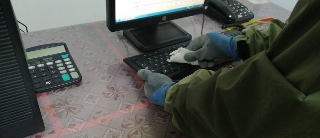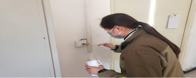在宿舍,檢查留宿人員、進行衛生消毒等“疫情”防控工作。