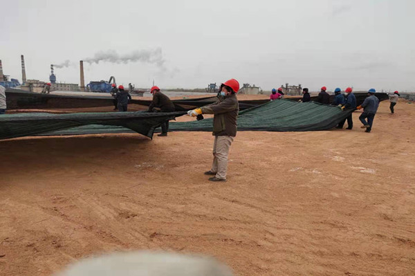 由于公司電石泥堆場地更換為新原料堆場造成的部分土地裸露,造成揚塵污染,治風沙、阻揚塵這項工作迫在眉睫;初冬的天氣冷風呼啦啦掃動著滿地的枯葉紙屑,濃黑的云像一團團破絮,倒懸在我們的上空,北風呼呼那個吹,任憑它的怎么肆虐卻擊退不了職工們工作的熱情,瞧他們單膝蓋在潮濕的泥土上細心的用鐵絲鏈接著每個接口。男職工展現大力水手的魅力,兩人一卷,一人一卷有序的擺放在裸露的土地中央,女同事也不甘示弱拆開整卷防塵網整齊的鋪在砂石頂部,大家喊著整齊的口號,經過一早上不懈努力,就將整個原料場地覆蓋完畢。既抑制滿天風沙的場景,也保存了大量的原料被風帶走,造成原料損耗。