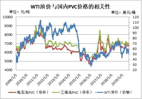 國內(nèi)PVC的生產(chǎn)工藝主要有兩種。一是電石法,主要生產(chǎn)原料是電石、煤炭和原鹽;二是乙烯法,主要原料是石油。國際市場上PVC的生產(chǎn)以乙烯法為主,而國內(nèi)受富煤、貧油、少氣的資源稟賦限制,則以電石法為主。截至2018年底,國內(nèi)PVC產(chǎn)能為2404萬噸,其中電石法PVC產(chǎn)能為1962萬噸,乙烯法PVC產(chǎn)能為442萬噸,電石法產(chǎn)能和乙烯法產(chǎn)能的占比分別為81.6%和18.4%。由于電石法PVC占據(jù)主導(dǎo)地位,原油價(jià)格的變化對國內(nèi)PVC影響較小。統(tǒng)計(jì)顯示,2009年1月至2019年11月,華東市場電石法PVC和乙烯法PVC與WTI油價(jià)的相關(guān)系數(shù)分別為0.42和0.51,相關(guān)性并不高。
